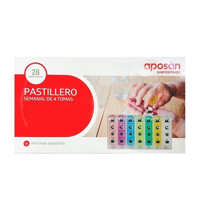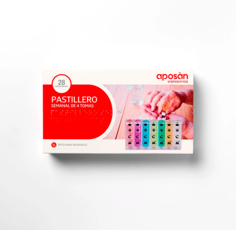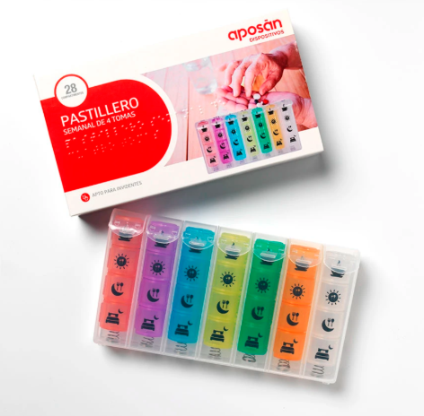 Pilulier hebdomadaire avec 4 doses quotidiennes d'Aposán. Pilulier hebdomadaire avec quatre doses et séparation quotidienne pour tous ceux qui veulent avoir le contrôle de leurs médicaments, même pour les aveugles.