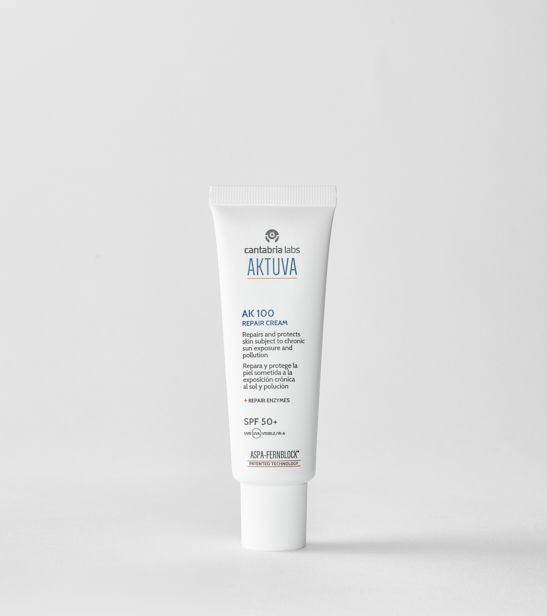 La crème réparatrice Aktuva AK100 est une crème fluide, réparatrice et protectrice, indiquée pour les peaux soumises à une exposition solaire intense et prolongée, ainsi qu'à la pollution environnementale. Elle intègre la technologie brevetée Aspa-Fernblock® et son mécanisme de réparation innovant, ainsi que des actifs de nouvelle génération qui hydratent en profondeur, renforcent la barrière cutanée et contribuent à atténuer les rougeurs. Convient à tous les types de peau, même les plus sensibles.